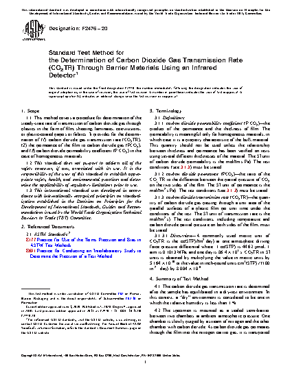 1.1 This method covers a procedure for determination of the steady-state rate of transmission of carbon dioxide gas through plastics in the form of film, sheeting, laminates, coextrusions, or plastic-coated papers or fabrics. It provides for the determination of (1) carbon dioxide gas transmission rate (CO2TR), (2) the permeance of the film to carbon dioxide gas (P’CO2) , and (3) carbon dioxide permeability coefficient (P”CO2) in the case of homogeneous materials.