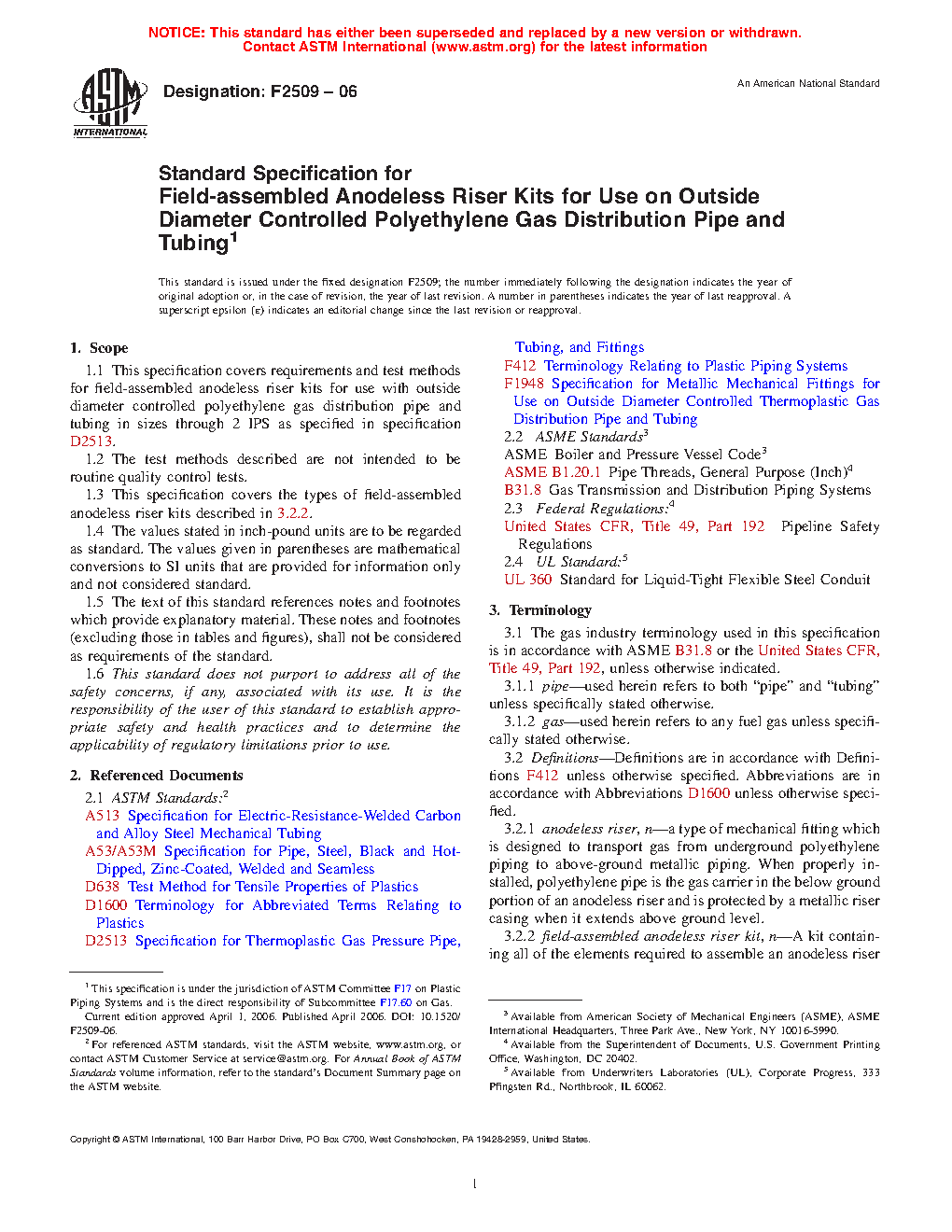 This specification covers the qualification requirements and test methods for field-assembled anodeless riser kits for use with outside diameter controlled polyethylene gas distribution pipes and tubing in sizes of up to 2 IPS. The anodeless riser kits shall be manufactured in accordance with the specified materials, physical properties, and design, which include the riser casings, moisture seals, threads, bend radius, coatings, welding procedures, and riser adapter to riser casing connections. The riser adapter to riser casing connections shall tested by tensile pull testing.