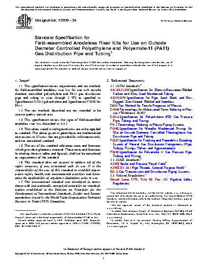 1.1 This specification covers requirements and test methods for field-assembled anodeless riser kits for use with outside diameter controlled polyethylene and PA11 gas distribution pipe and tubing in sizes through 2 IPS as specified in Specification D2513 polyethylene and Specification F2945 for PA11.