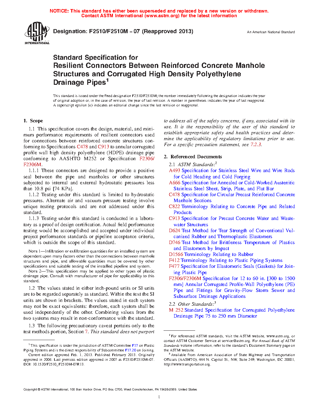 1.1 This specification covers the design, material, and minimum performance requirements of resilient connectors used for connections between reinforced concrete structures conforming to Specifications C478 and C913 to annular corrugated profile wall high density polyethylene (HDPE) drainage and sewer pipe conforming to AASHTO M252, M294, and M330 or Specifications F2306/F2306M, F2648/F2648M, F2736, F2763, F2764/F2764M, and F2947/F2947M.