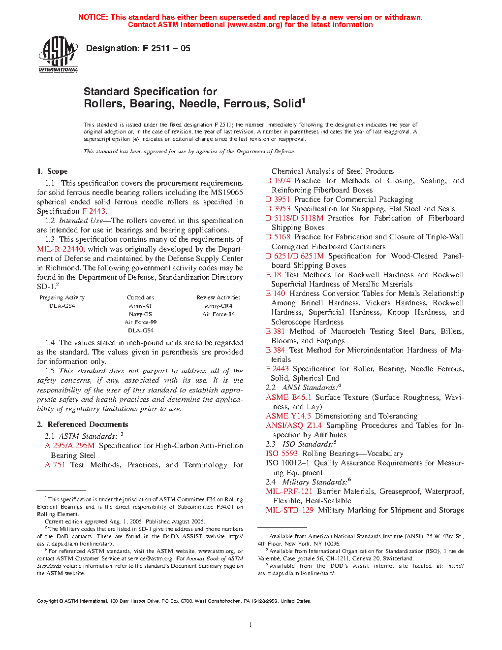 1.1 This specification covers the procurement requirements for solid ferrous needle bearing rollers including the MS19065 spherical ended solid ferrous needle rollers as specified in Specification F2443.