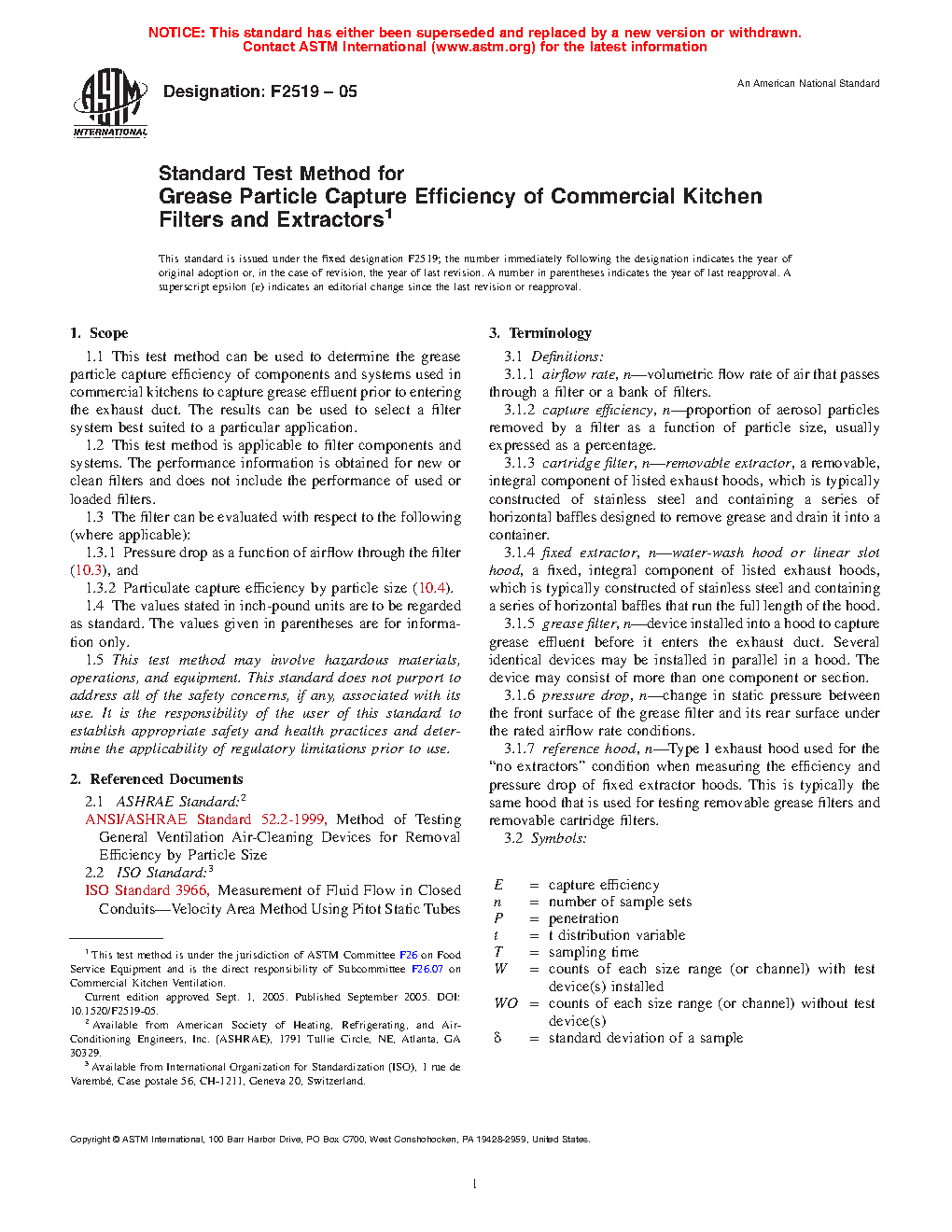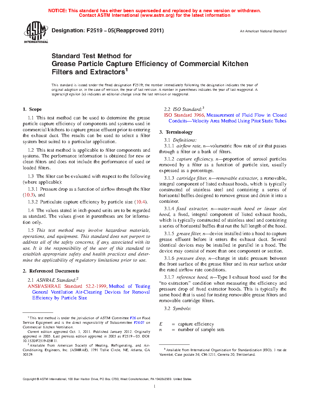 1.1 This test method can be used to determine the grease particle capture efficiency of components and systems used in commercial kitchens to capture grease effluent prior to entering the exhaust duct. The results can be used to select a filter system best suited to a particular application.