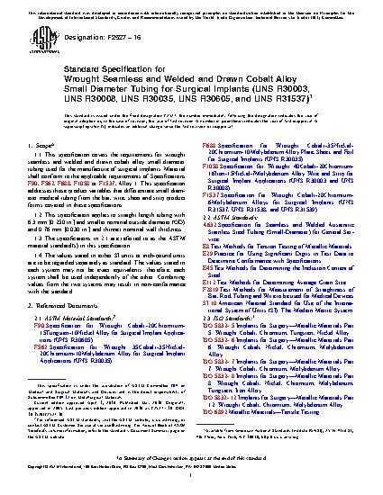 This specification covers the requirements for wrought seamless and welded and drawn cobalt alloy small diameter tubing used for the manufacture of surgical implants. Product variables that differentiate small diameter medical tubing from the bar, wire, sheet, and strip product forms are addressed. This specification applies to straight length tubing of specified diameters and thickness. Seamless tubing shall be made from bar, hollow bar, rod, or hollow rod raw material forms through a prescribed process. Welded and drawn tubing shall be made from strip or sheet raw material forms that meet the specified chemical requirements. The tubing shall be subject to tensile testing.