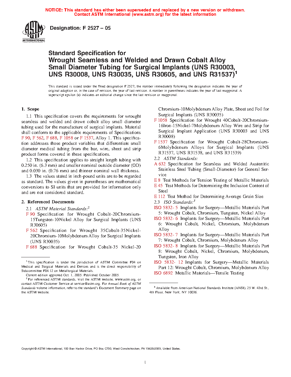 1.1 This specification covers the requirements for wrought seamless and welded and drawn cobalt alloy small diameter tubing used for the manufacture of surgical implants. Material shall conform to the applicable requirements of Specifications F90, F562, F688, F1058 or F1537, Alloy 1. This specification addresses those product variables that differentiate small diameter medical tubing from the bar, wire, sheet and strip product forms covered in these specifications.