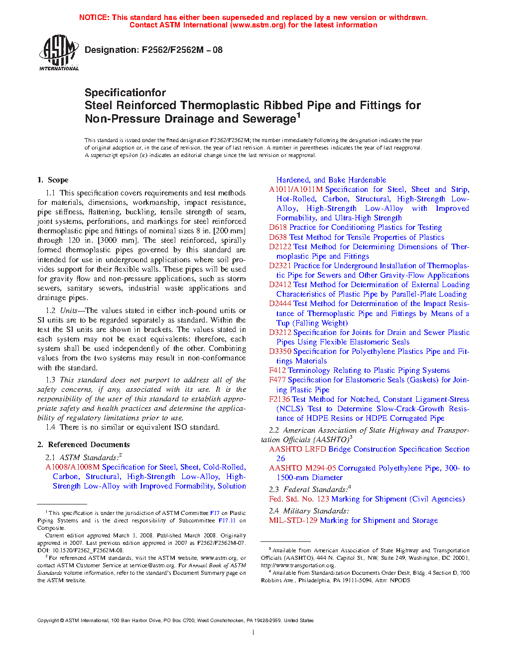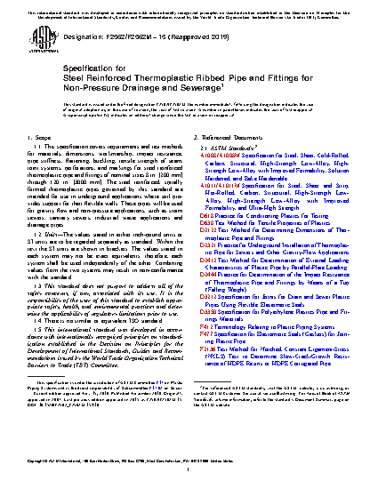 1.1 This specification covers requirements and test methods for materials, dimensions, workmanship, impact resistance, pipe stiffness, flattening, buckling, tensile strength of seam, joint systems, perforations, and markings for steel reinforced thermoplastic pipe and fittings of nominal sizes 8 in. [200 mm] through 120 in. [3000 mm]. The steel reinforced, spirally formed thermoplastic pipes governed by this standard are intended for use in underground applications where soil provides support for their flexible walls. These pipes will be used for gravity flow and non-pressure applications, such as storm sewers, sanitary sewers, industrial waste applications and drainage pipes.