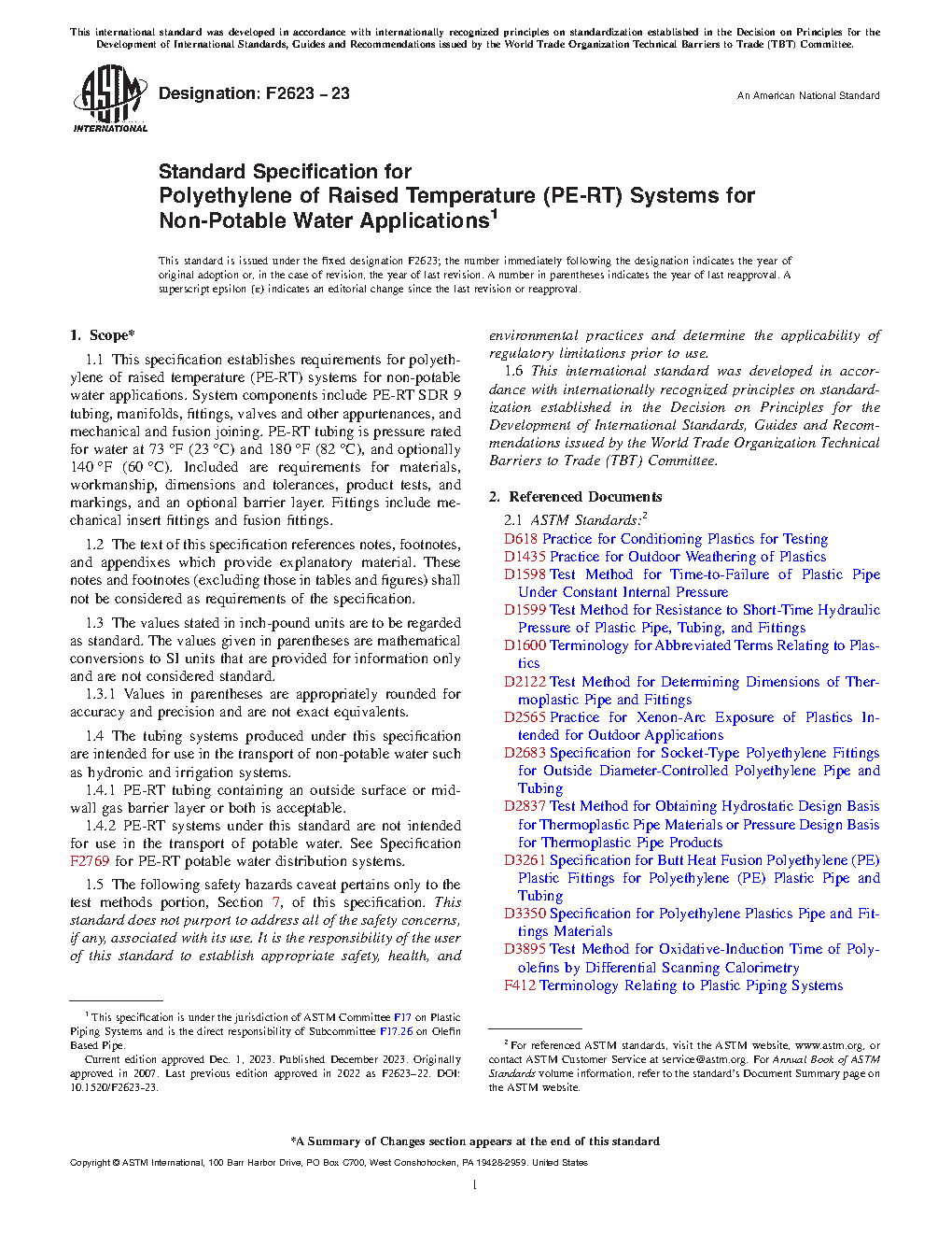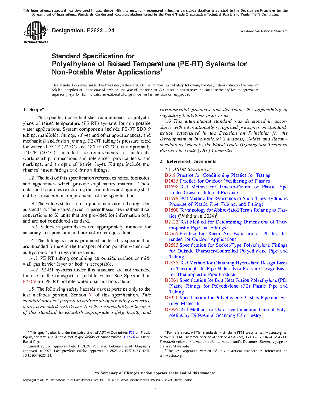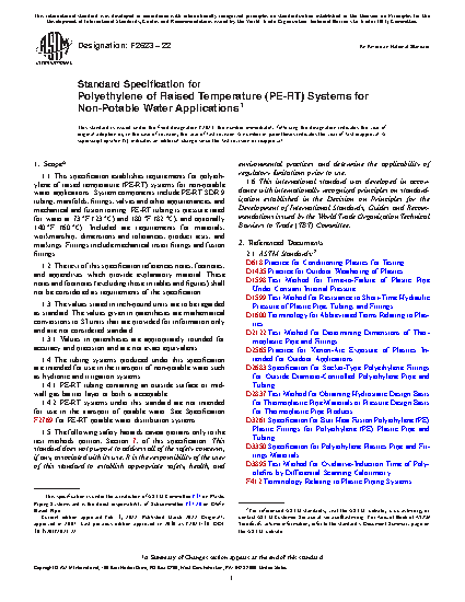 1.4 The tubing systems produced under this specification are intended for use in the transport of non-potable water such as hydronic and irrigation systems.