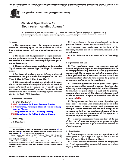 This specification prescribes the function and performance criteria, and acceptance testing for electrically insulating aprons for the protection of workers from incidental contact with live electrical apparatus or circuits. Three types of aprons are provided and are designated as follows: Type I, made from properly vulcanized high-grade cis-1,4-polyisoprene rubber compound of natural or synthetic origin that are non-resistant to ozone; Type II, made of any elastomer or combination of elastomeric compounds that are resistant to ozone; and Type III, made of any combination of elastomer and thermoplastic polymers that are elastic in nature and resistant to ozone. Six classes of insulating aprons, designated as Class 00, 0, 1, 2, 3, and 4, are assigned according to electrical characteristics. Aprons shall be tested for their conformance with specified chemical, physical, and electrical requirements.