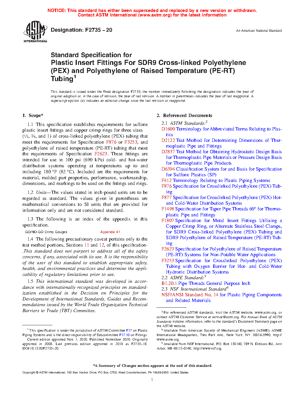 1.1 This specification establishes requirements for sulfone plastic insert fittings and copper crimp rings for three sizes (1/2 , 3/4 , and 1) of cross-linked polyethylene (PEX) tubing that meet the requirements for Specification F876 or F3253, and polyethylene of raised temperature (PE-RT) tubing that meet the requirements of Specification F2623. These fittings are intended for use in 100 psi (690 kPa) cold- and hot-water distribution systems operating at temperatures up to and including 180 °F (82 °C). Included are the requirements for material, molded part properties, performance, workmanship, dimensions, and markings to be used on the fittings and rings.