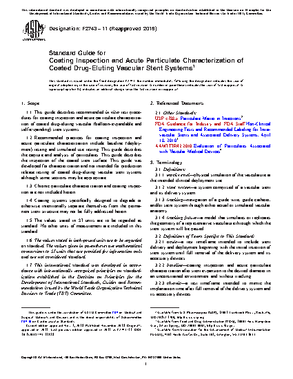 1.2 Recommended practices for coating inspection and acute particulate characterization include baseline (deployment) testing and simulated use testing. This guide describes the capture and analysis of particulates. This guide describes the inspection of the coated stent surface. This guide was developed for characterization and not intended for production release testing of coated drug-eluting vascular stent systems, although some sections may be appropriate.