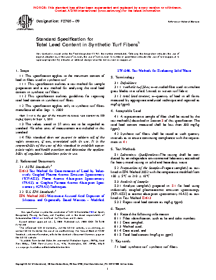This specification details the test methods for sample preparation and analyzing, as well as guidelines for reporting the total lead content in fibers used in synthetic turf. Synthetic turf fibers shall be tested at such quantity intervals as to ensure continuing compliance with test requirements. The measured total lead content shall be within the limit specified herein.