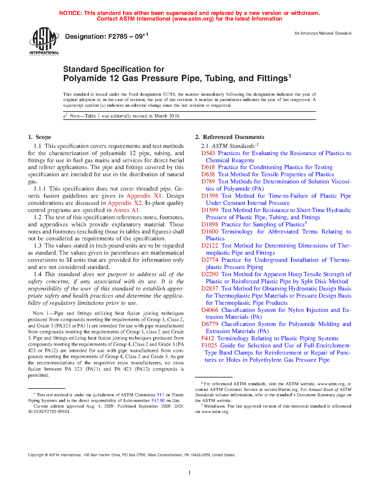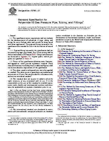 1.1 This specification covers requirements and test methods for the characterization of polyamide 12 pipe, tubing, and fittings for use in fuel gas mains and services for direct burial and reliner applications. The pipe and fittings covered by this specification are intended for use in the distribution of natural gas.