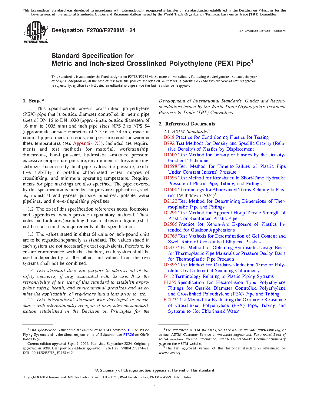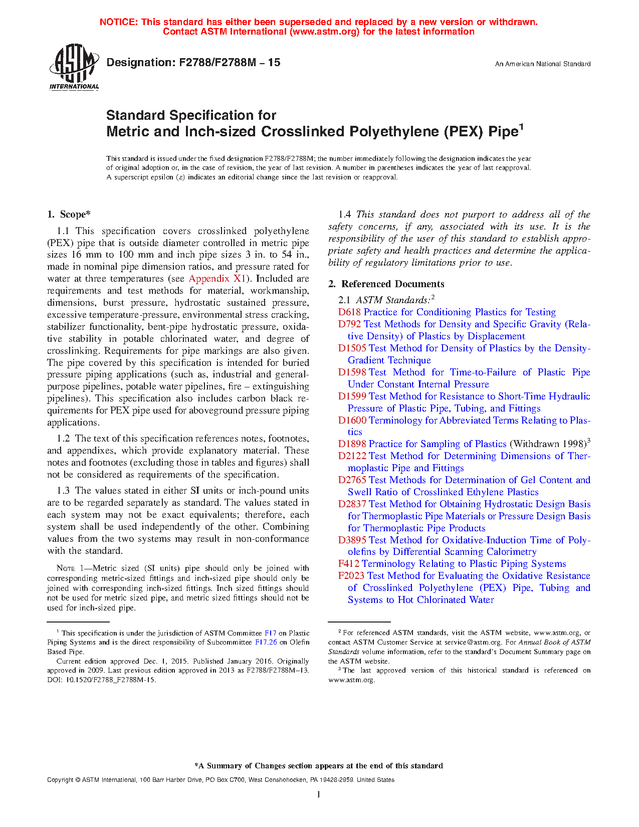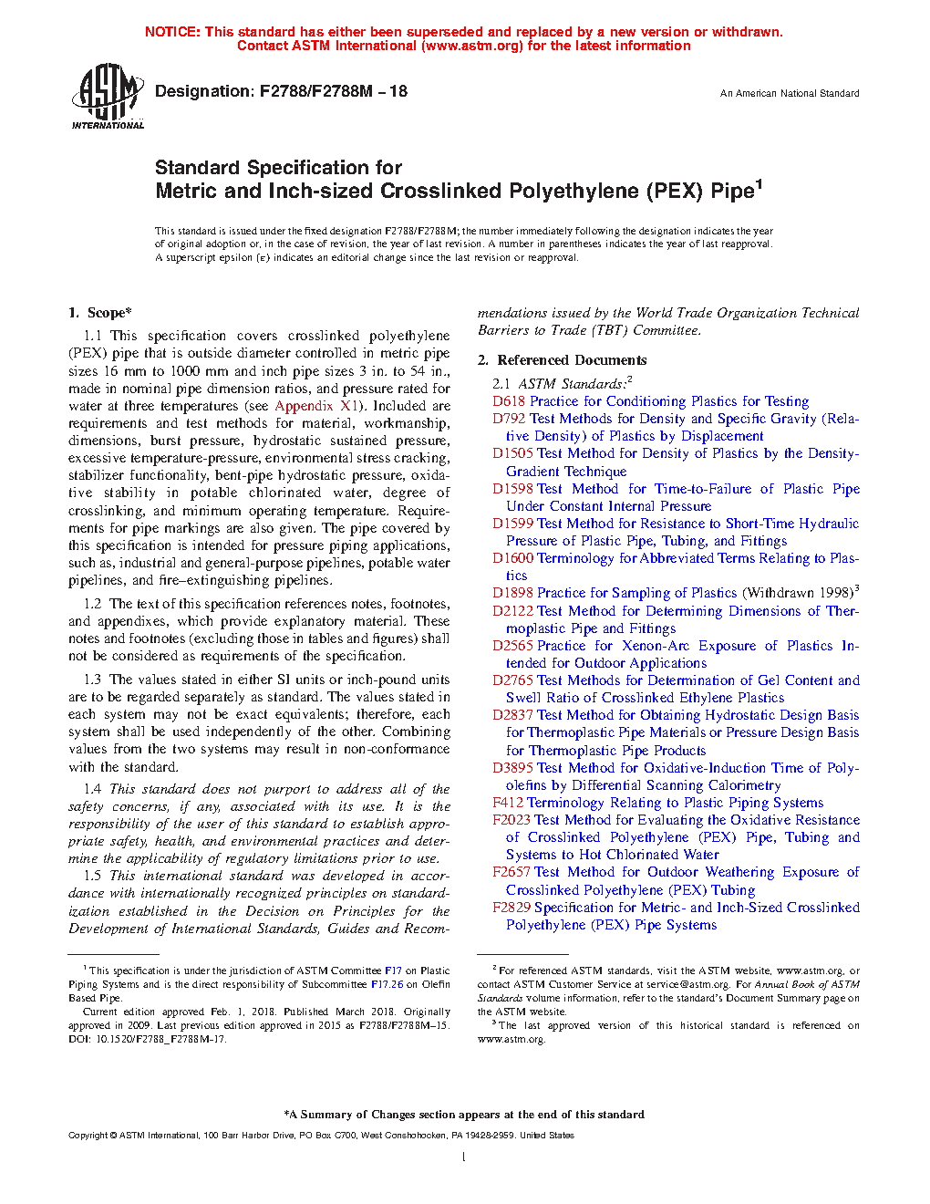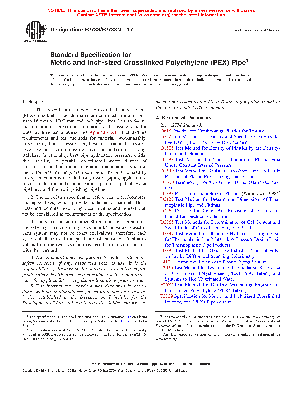 1.1 This specification covers crosslinked polyethylene (PEX) pipe that is outside diameter controlled in metric pipe sizes of DN 16 to DN 1000 (approximate outside diameters of 16 to 1005 mm) and inch pipe sizes NPS 3 to NPS 54 (approximate outside diameters of 3.5 to 54 in.), made in nominal pipe dimension ratios, and pressure rated for water at three temperatures (see Appendix X1). Included are requirements and test methods for material, workmanship, dimensions, burst pressure, hydrostatic sustained pressure, excessive temperature-pressure, environmental stress cracking, stabilizer functionality, bent-pipe hydrostatic pressure, oxidative stability in potable chlorinated water, degree of crosslinking, and minimum operating temperature. Requirements for pipe markings are also specified. The pipe covered by this specification is intended for pressure applications, such as, industrial and general-purpose pipelines, potable water pipelines, and fire–extinguishing pipelines