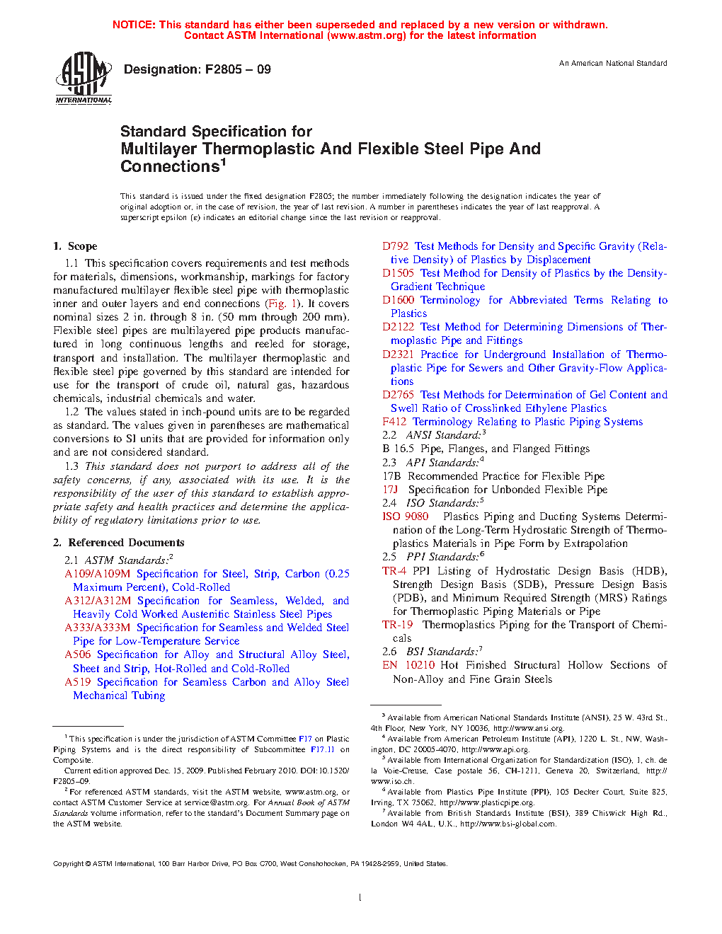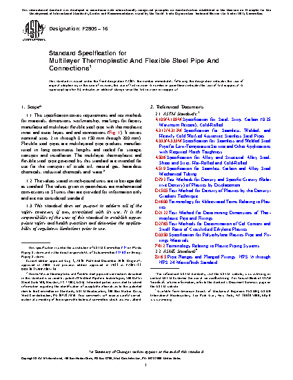 1.1 This specification covers requirements and test methods for materials, dimensions, workmanship, markings for factory manufactured multilayer flexible steel pipe with thermoplastic inner and outer layers and end connections (Fig. 1). It covers nominal sizes 2 in. through 8 in. (50 mm through 200 mm). Flexible steel pipes are multilayered pipe products manufactured in long continuous lengths and reeled for storage, transport and installation. The multilayer thermoplastic and flexible steel pipe governed by this standard are intended for use for the transport of crude oil, natural gas, hazardous chemicals, industrial chemicals and water.2