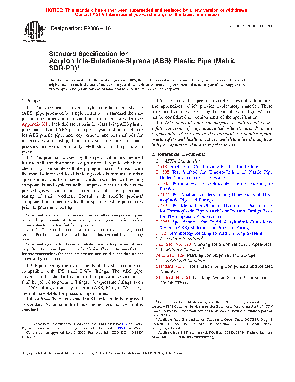 Note 2: This specification addresses only pipe for use in above ground service. For buried service consult the manufacturer and local building codes.