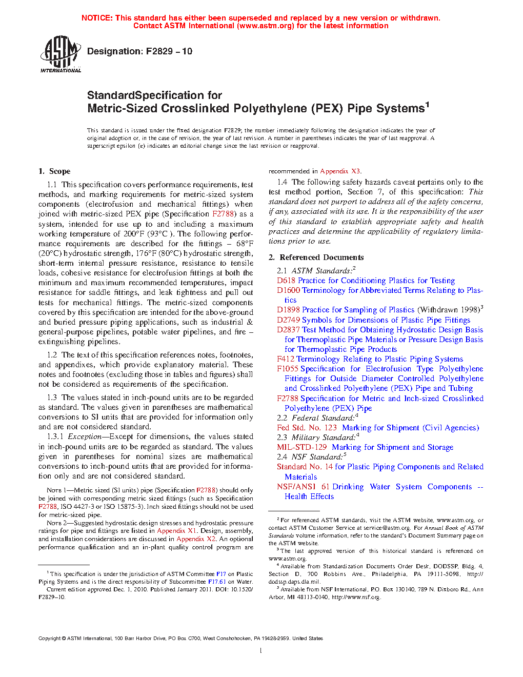 Note 1: Suggested hydrostatic design stresses and hydrostatic pressure ratings for pipe and fittings are listed in Appendix X1. Design, assembly, and installation considerations are discussed in Appendix X2. An optional performance qualification and an in-plant quality control program are recommended in Appendix X3.