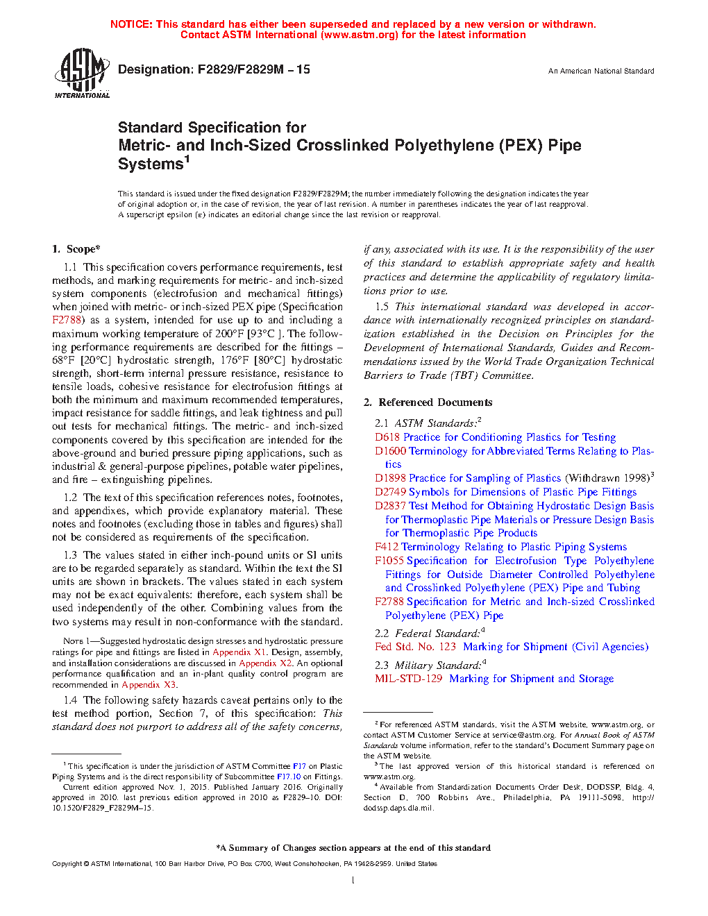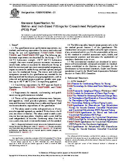 1.2 Crosslinking requirements for PEX pipe are found in Specifications F2788/F2788M, F2905/F2905M, and F2968/F2968M.