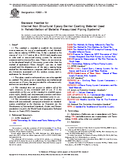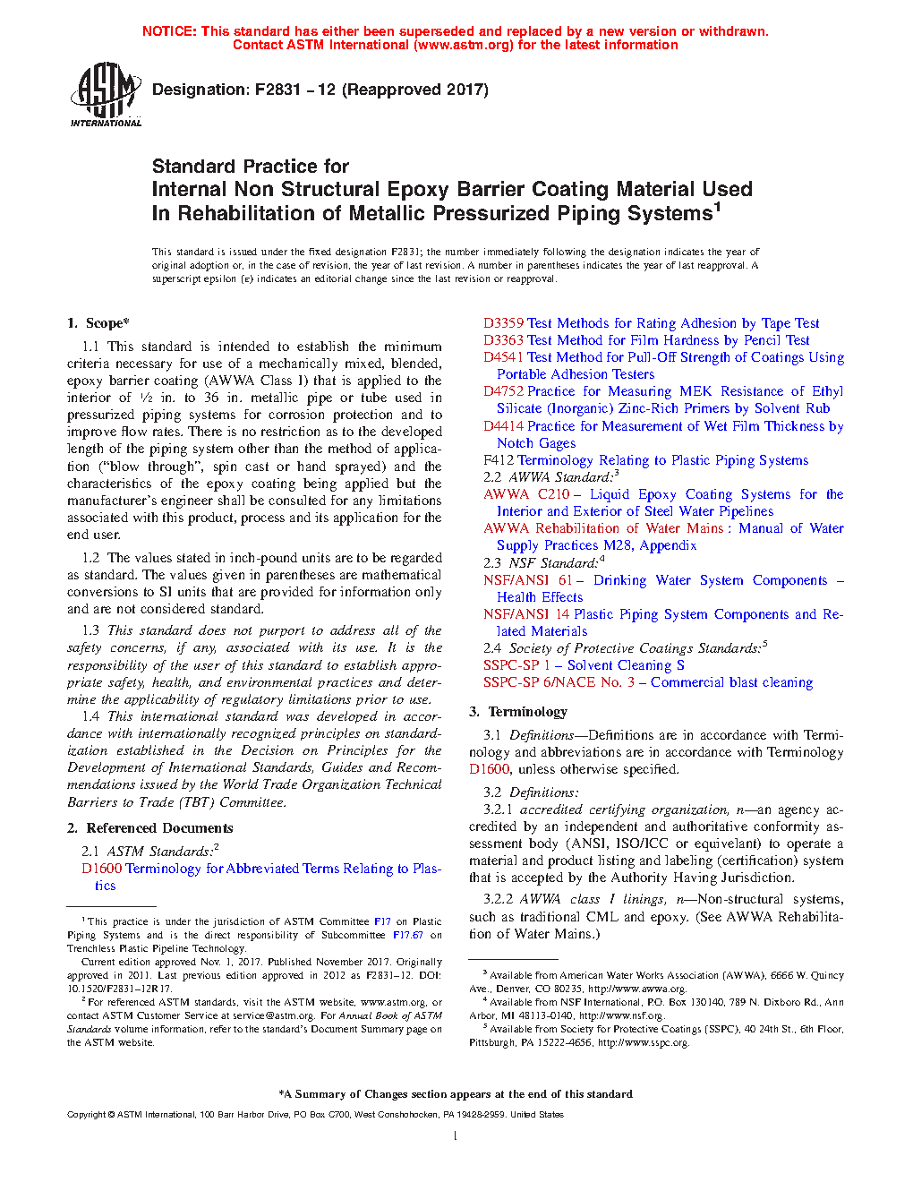 1.1 This standard is intended to establish the minimum criteria necessary for use of a mechanically mixed, blended, epoxy barrier coating (AWWA Class I) that is applied to the interior of 1/2 in. to 36 in. metallic pipe or tube used in pressurized piping systems for corrosion protection and to improve flow rates. There is no restriction as to the developed length of the piping system other than the method of application (“blow through”, spin cast or hand sprayed) and the characteristics of the epoxy coating being applied but the manufacturer’s engineer shall be consulted for any limitations associated with this product, process and its application for the end user.