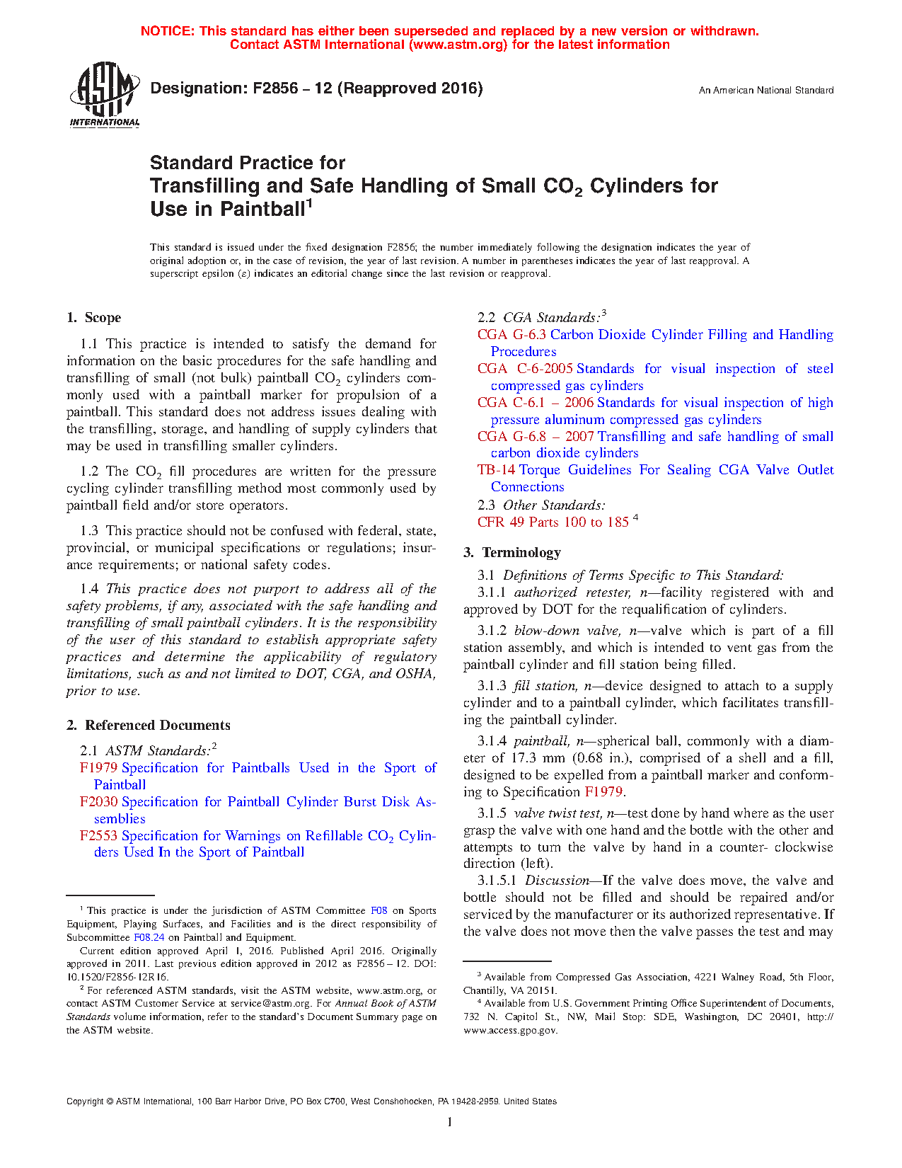 1.4 This practice does not purport to address all of the safety problems, if any, associated with the safe handling and transfilling of small paintball cylinders. It is the responsibility of the user of this standard to establish appropriate safety practices and determine the applicability of regulatory limitations, such as and not limited to DOT, CGA, and OSHA, prior to use.