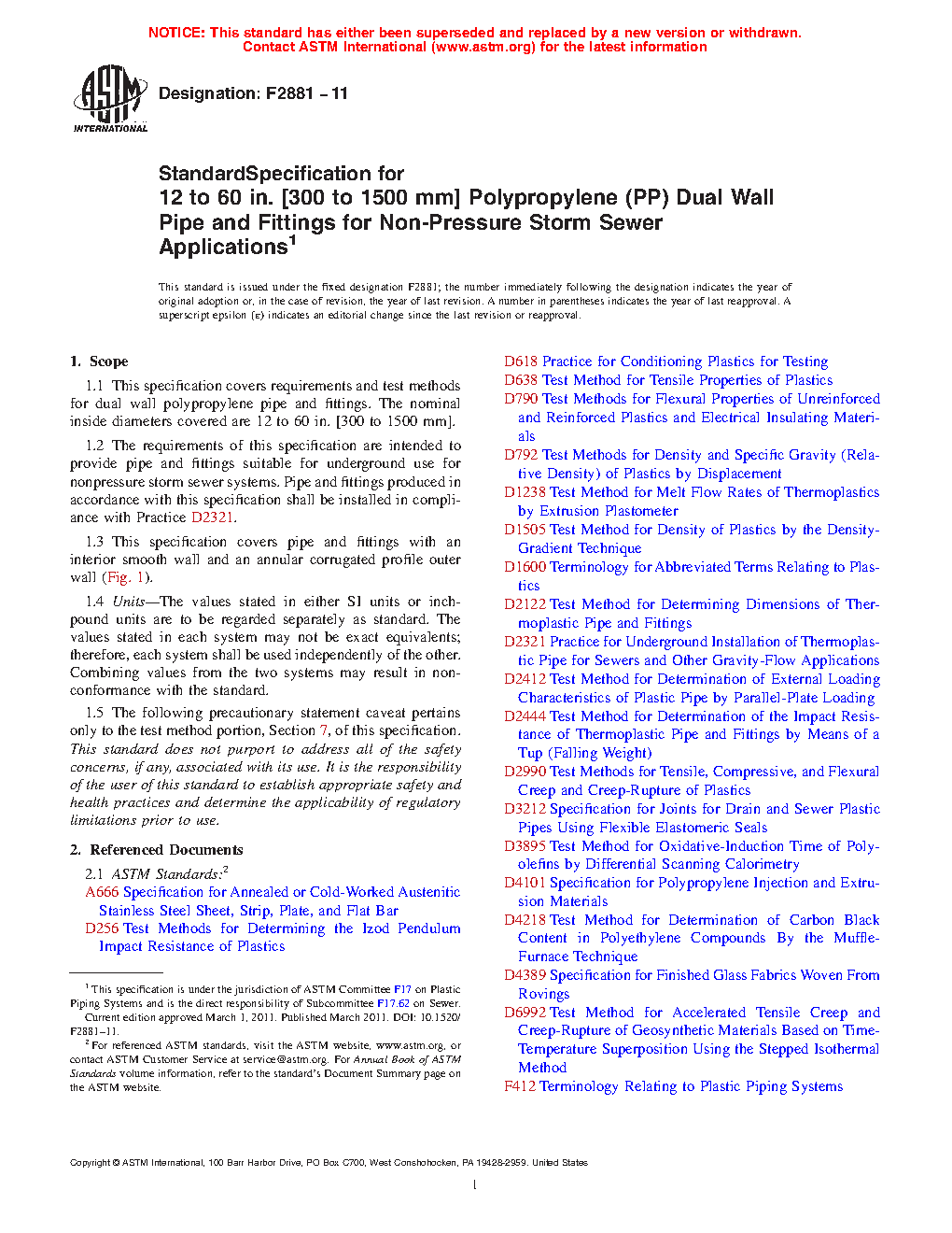 1.1 This specification covers requirements and test methods for dual wall polypropylene pipe and fittings. The nominal inside diameters covered are 12 to 60 in. [300 to 1500 mm].