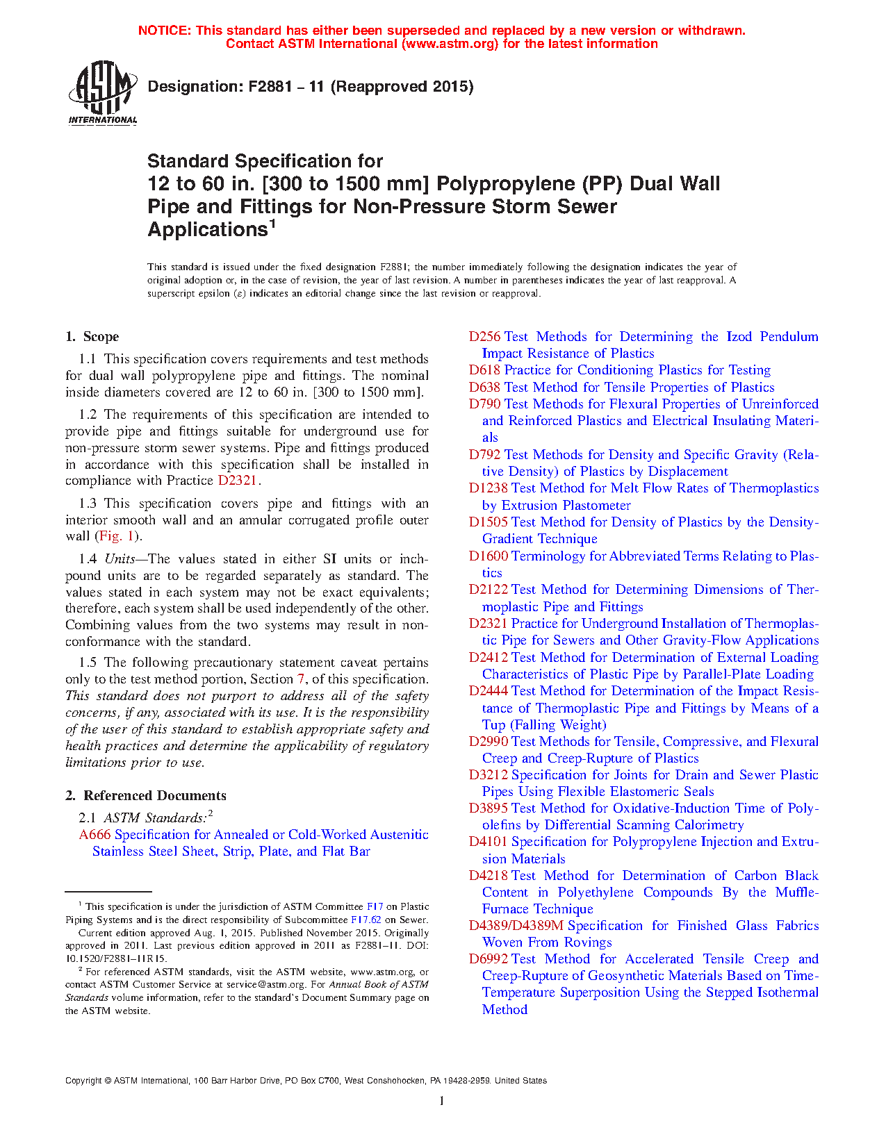 1.1 This specification covers requirements and test methods for dual wall polypropylene pipe and fittings. The nominal inside diameters covered are 12 to 60 in. [300 to 1500 mm].