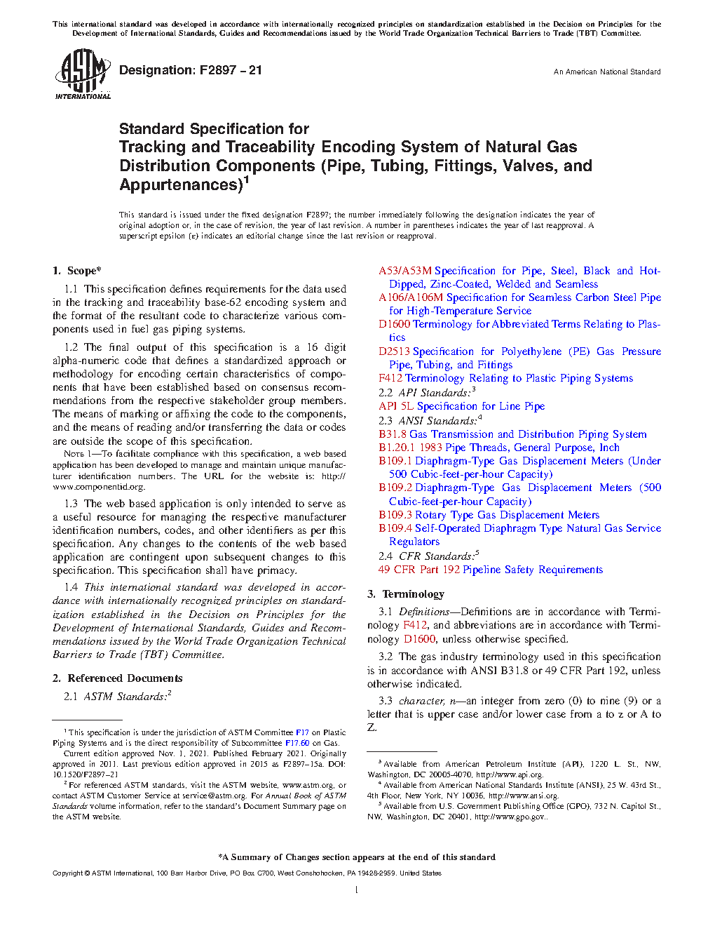 1.1 This specification defines requirements for the data used in the tracking and traceability base-62 encoding system and the format of the resultant code to characterize various components used in fuel gas piping systems.