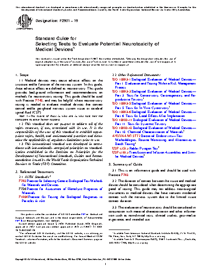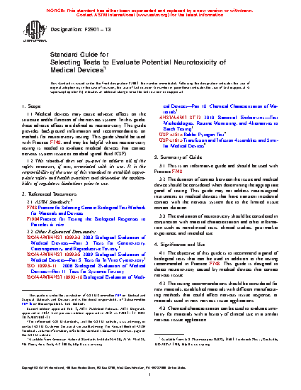 1.1 Medical devices may cause adverse effects on the structure and/or function of the nervous system. In this guide, these adverse effects are defined as neurotoxicity. This guide provides background information and recommendations on methods for neurotoxicity testing. This guide should be used with Practice F748, and may be helpful where neurotoxicity testing is needed to evaluate medical devices that contact central and/or peripheral nervous system tissue or cerebral spinal fluid (CSF).