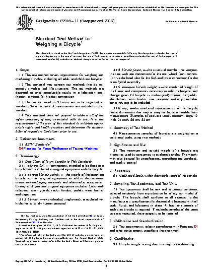 1.1 This test method covers requirements for weighing and marketing bicycles, including all adult, and childrens bicycles.