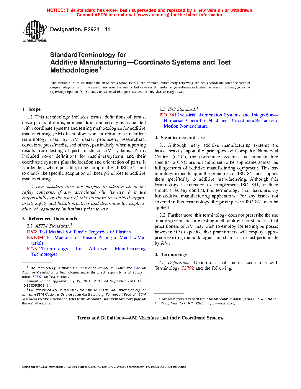 1.1 This terminology includes terms, definitions of terms, descriptions of terms, nomenclature, and acronyms associated with coordinate systems and testing methodologies for additive manufacturing (AM) technologies in an effort to standardize terminology used by AM users, producers, researchers, educators, press/media, and others, particularly when reporting results from testing of parts made on AM systems. Terms included cover definitions for machines/systems and their coordinate systems plus the location and orientation of parts. It is intended, where possible, to be compliant with ISO 841 and to clarify the specific adaptation of those principles to additive manufacturing.
