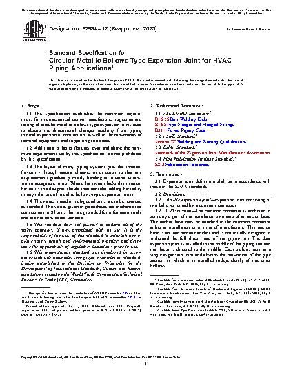1.1 This specification establishes the minimum requirements for the mechanical design, manufacture, inspection and testing of circular metallic bellows-type expansion joints used to absorb the dimensional changes resulting from piping thermal expansion or contraction, as well as the movements of terminal equipment and supporting structures.