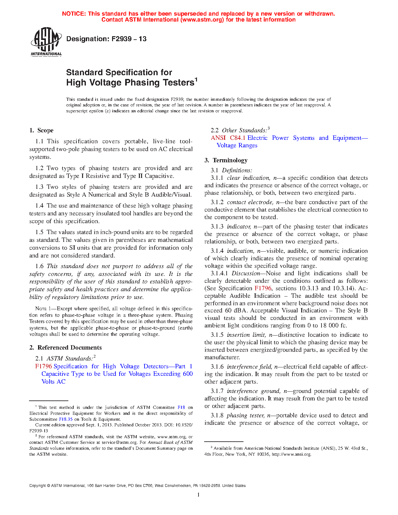 Note 1: Except where specified, all voltage defined in this specification refers to phase-to-phase voltage in a three-phase system. Phasing Testers covered by this specification may be used in other than three-phase systems, but the applicable phase-to-phase or phase-to-ground (earth) voltages shall be used to determine the operating voltage.