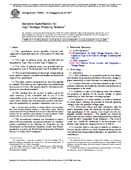 This specification defines the requirements for portable, live-line tool-supported two-pole phasing testers to be used on AC electrical systems. It provides two types of phasing testers, designated as Type I Resistive and Type II Capacitive, and two styles of phasing testers, designated as Style A Numerical and Style B Audible/Visual. It does not cover the use and maintenance of these high voltage phasing testers and any necessary insulated tool handles. The standard addresses ordering information for high voltage phasing testers, marking and instructions, workmanship, finish and appearance, testing, rejection and rehearing, certification, and precision and bias. Definitions of terms specific to this standard are provided, including clear indication, contact electrode, indicator, indication, insertion limit, interference field, interference ground, threshold angle, threshold voltage, and voltage range.