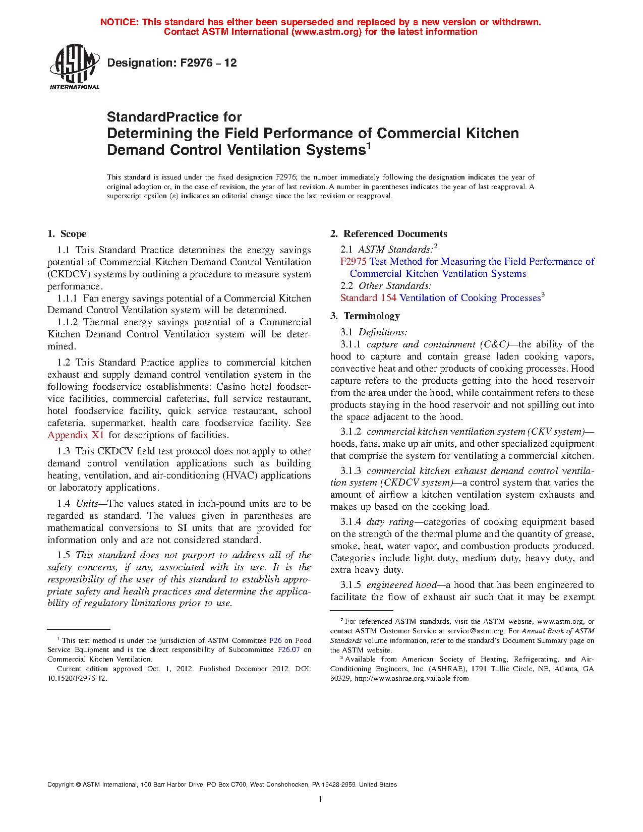 1.2 This Standard Practice applies to commercial kitchen exhaust and supply demand control ventilation system in the following foodservice establishments: Casino hotel foodservice facilities, commercial cafeterias, full service restaurant, hotel foodservice facility, quick service restaurant, school cafeteria, supermarket, health care foodservice facility. See Appendix X1 for descriptions of facilities.