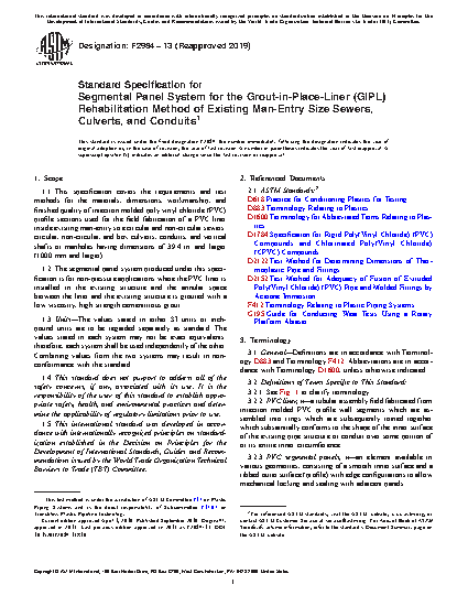 1.2 The segmental panel system produced under this specification is for non-pressure applications where the PVC liner is installed in the existing structure and the annular space between the liner and the existing structure is grouted with a low viscosity, high strength cementitious grout.