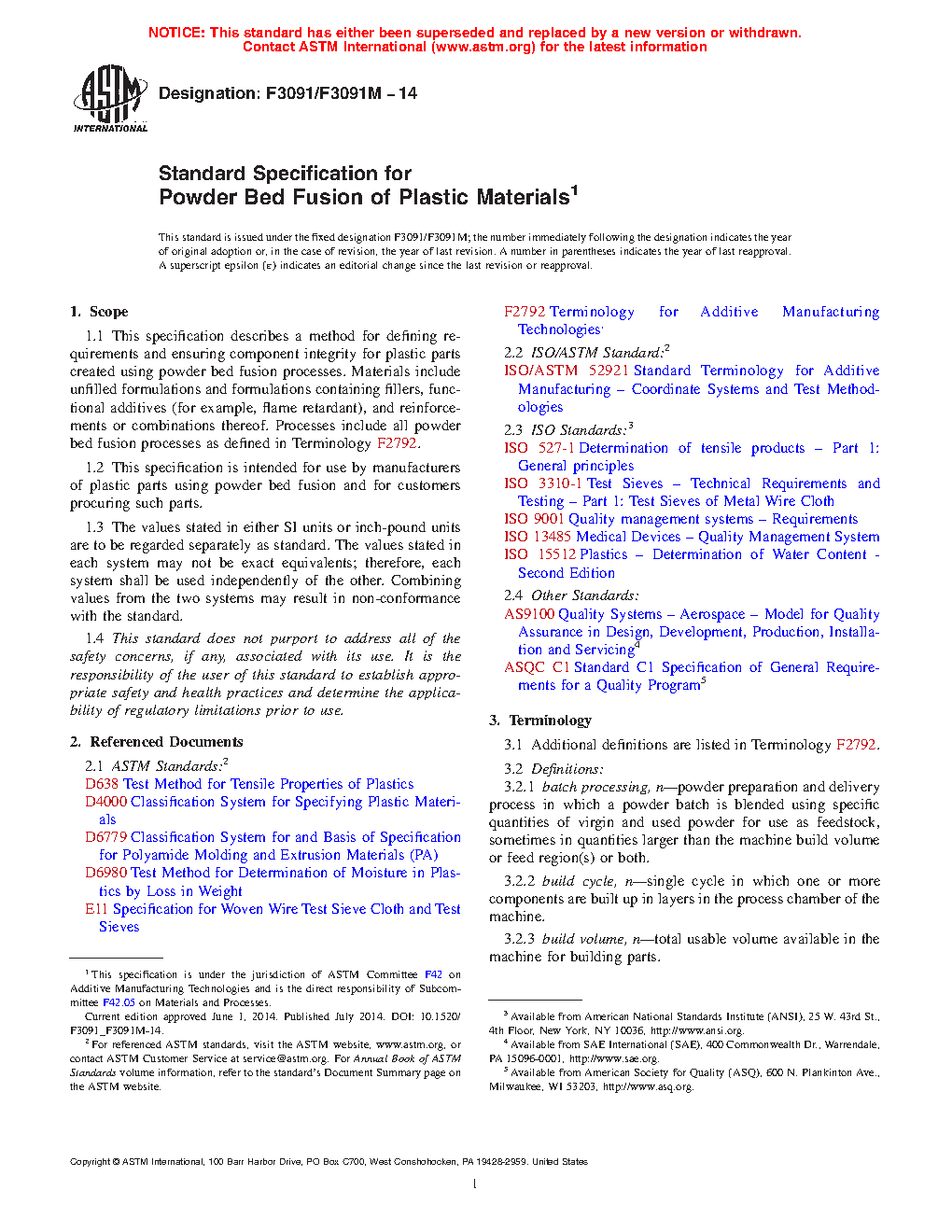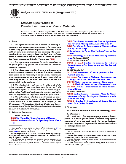 1.2 This specification is intended for use by manufacturers of plastic parts using powder bed fusion and for customers procuring such parts.