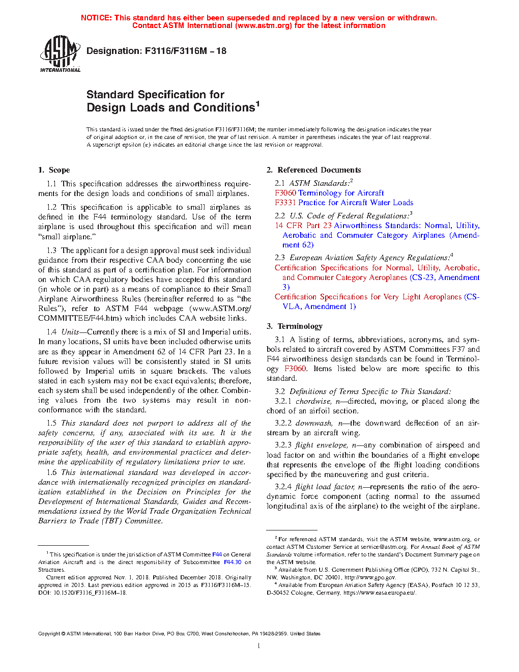 This specification covers airworthiness requirements for the design loads and conditions of small airplanes, and is applicable to small airplanes as defined in the F44 terminology standard. The applicant for a design approval must seek individual guidance from their respective civil aviation authority (CAA) body concerning the use of this specification as part of a certification plan.