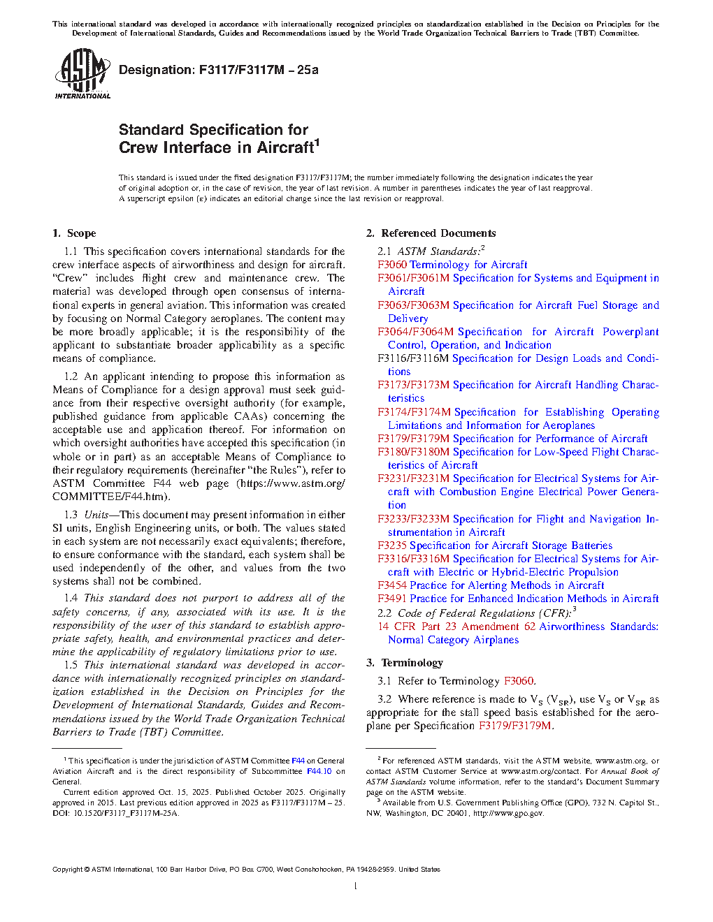 This specification covers international standards for the crew interface aspects of airworthiness and design for aircraft. The applicant for a design approval must seek the individual guidance of their respective civil aviation authority (CAA) body concerning the use of this specification as part of a certification plan.