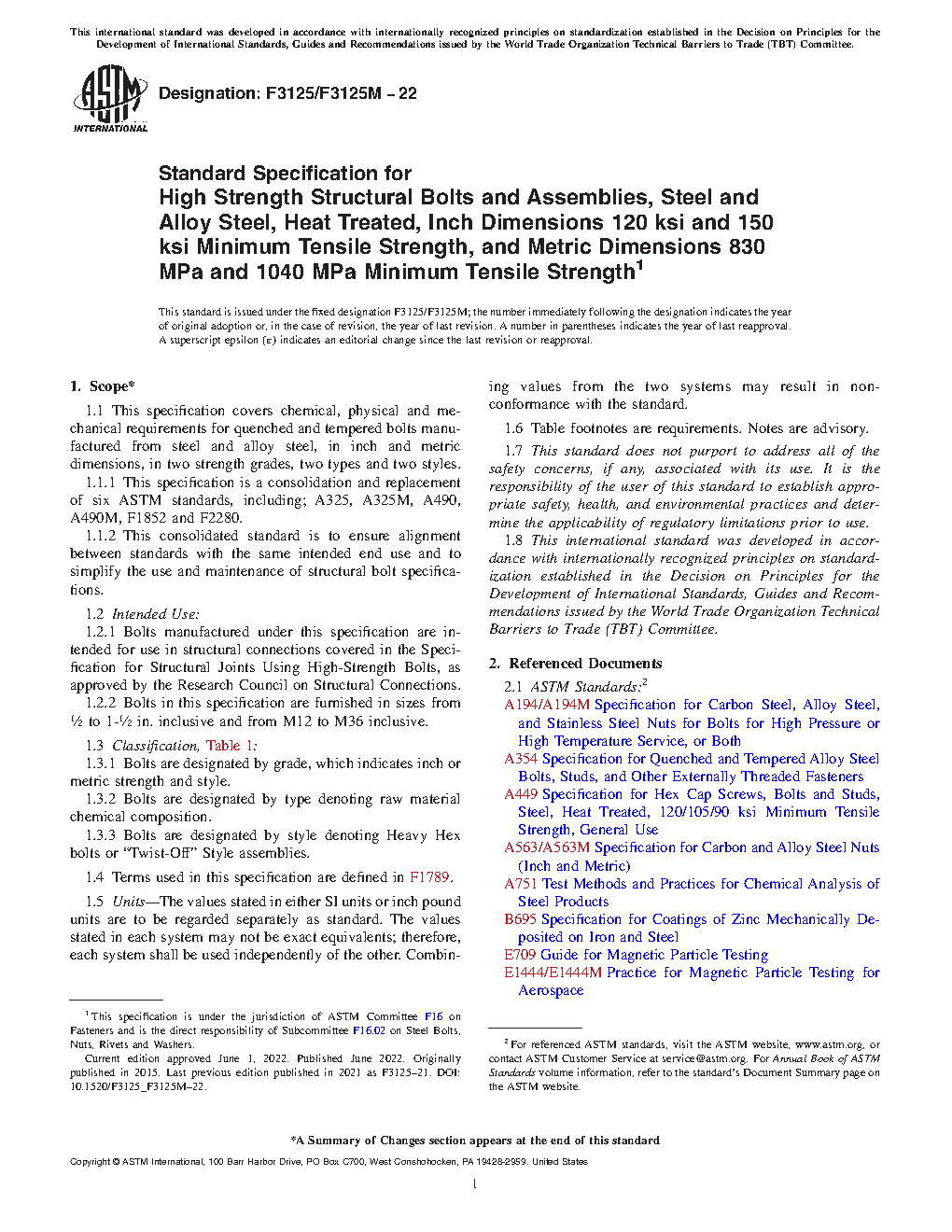 1.1.1 This specification was originally issued as a consolidation and replacement of six structural bolting ASTM standards, including; A325, A325M, A490, A490M, F1852 and F2280. One additional fastener grade, 144 ksi, is added with two types and two styles for inch series only.