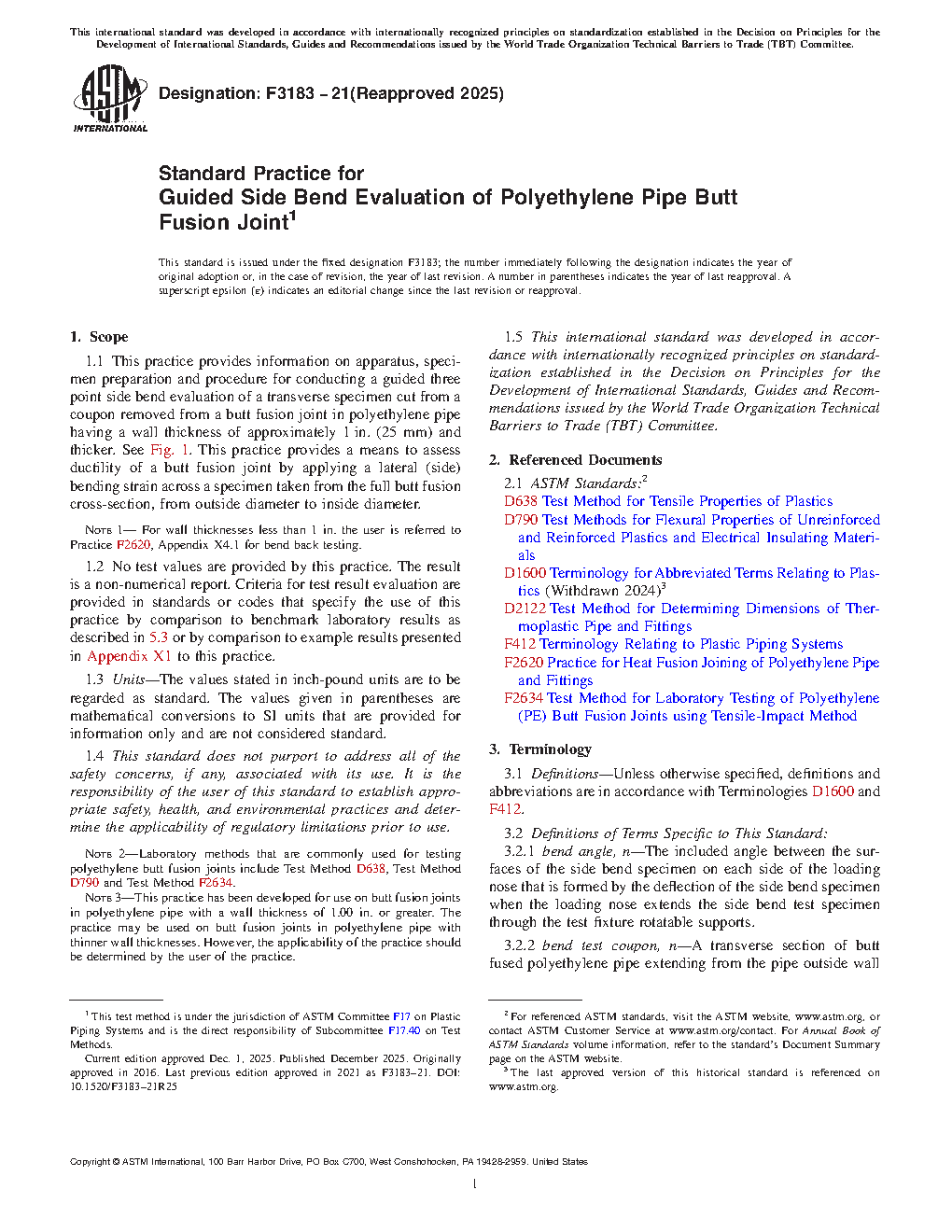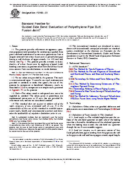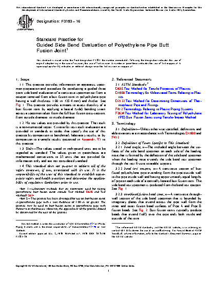 1.1 This practice provides information on apparatus, specimen preparation and procedure for conducting a guided three point side bend evaluation of a transverse specimen cut from a coupon removed from a butt fusion joint in polyethylene pipe having a wall thickness 1.00 in. (25.4 mm) and thicker. See Fig. 1. This practice provides a means to assess ductility of a butt fusion joint by applying a lateral (side) bending strain across a specimen taken from the full butt fusion cross-section, from outside diameter to inside diameter.