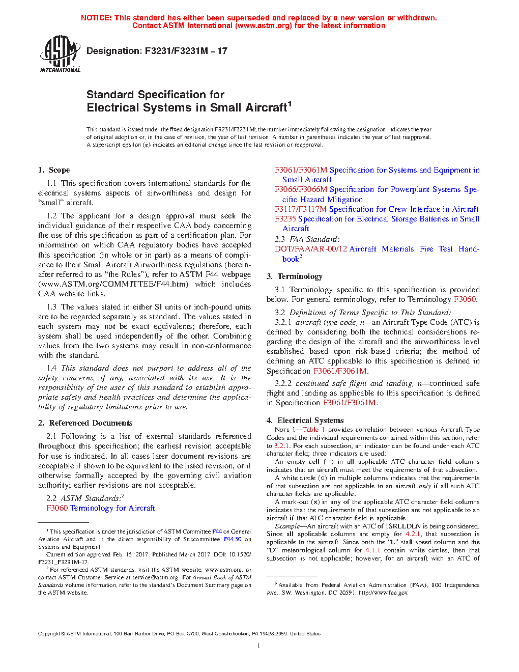 1.1 This specification covers international standards for the electrical systems aspects of airworthiness and design for “small” aircraft.
