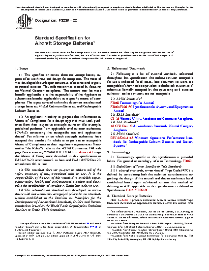1.1 This specification covers international standards for the electrical storage battery aspects of airworthiness and design for “small” aircraft.
