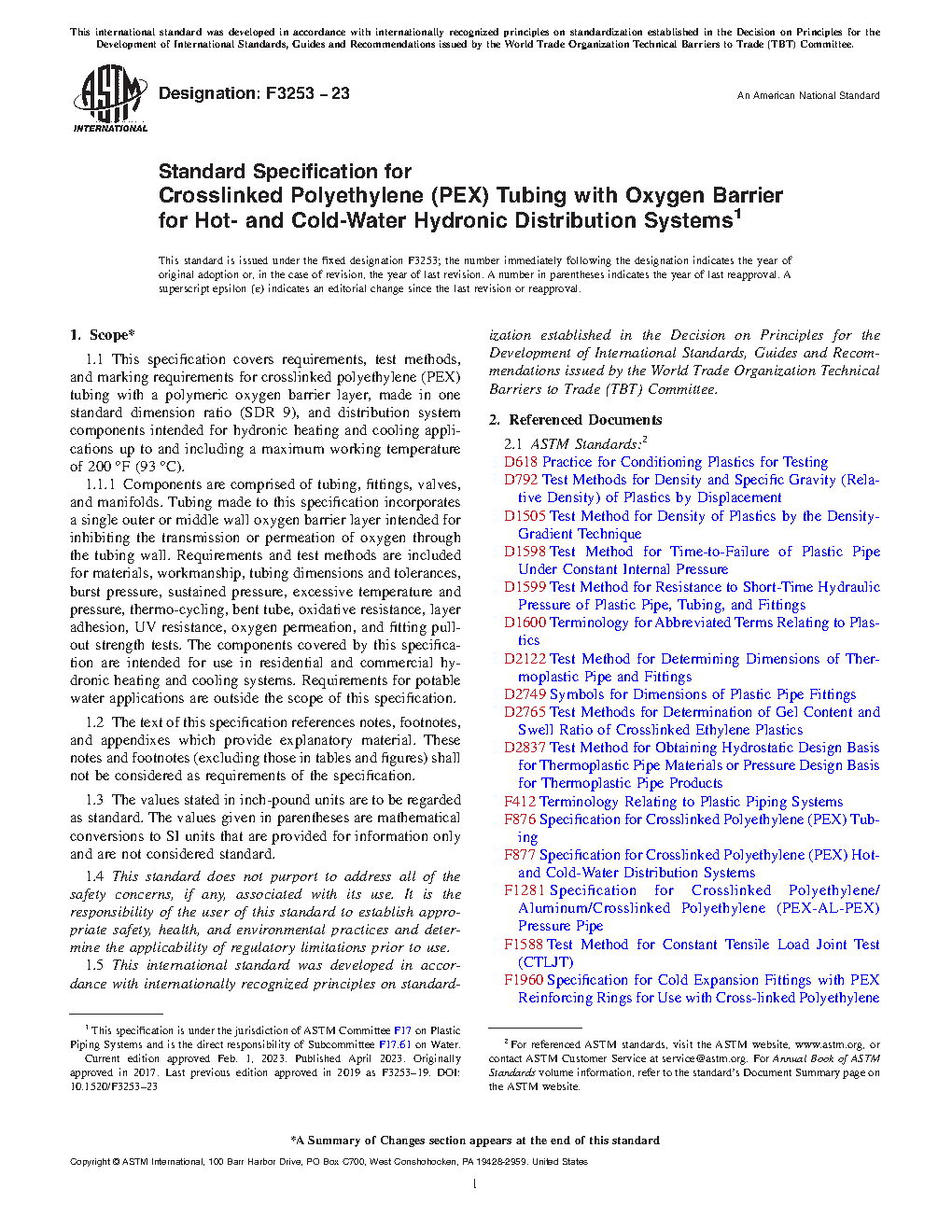 1.1 This specification covers requirements, test methods, and marking requirements for crosslinked polyethylene (PEX) tubing with a polymeric oxygen barrier layer, made in one standard dimension ratio (SDR 9), and distribution system components intended for hydronic heating and cooling applications up to and including a maximum working temperature of 200 °F (93 °C).