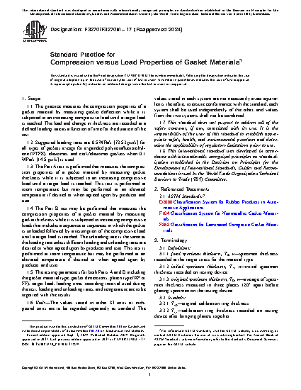 1.1 This practice measures the compression properties of a gasket material by measuring gasket deflection while it is subjected to an increasing compressive load until a target load is reached. The load and change in thickness are recorded at a defined loading rate as a function of time for the duration of the test.