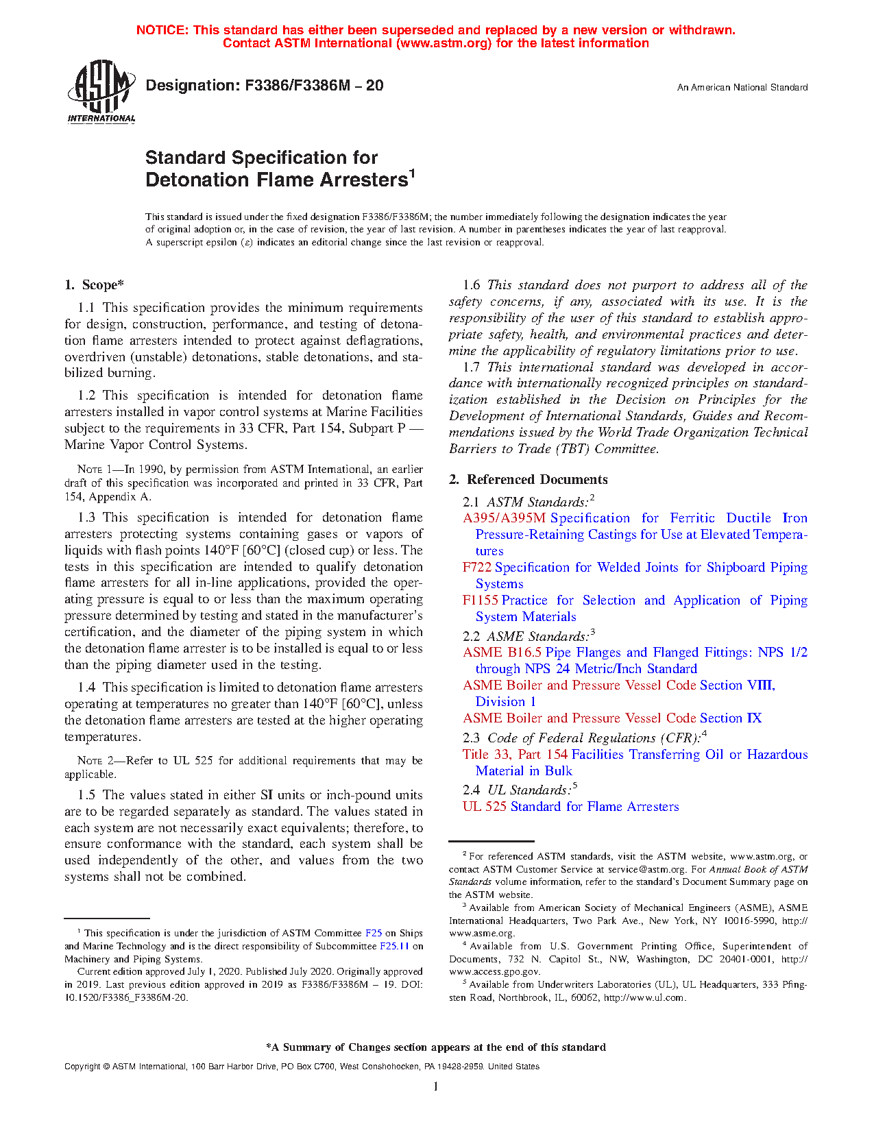 1.1 This specification provides the minimum requirements for design, construction, performance, and testing of detonation flame arresters intended to protect against deflagrations, overdriven (unstable) detonations, stable detonations, and stabilized burning.