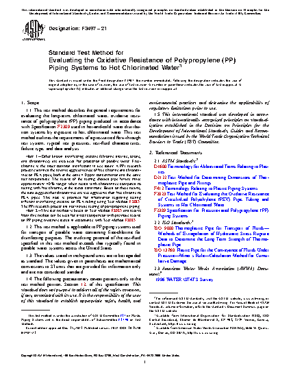 1.2 This test method is applicable to PP piping systems used for transport of potable water containing free-chlorine for disinfecting purposes. The oxidizing potential of the test-fluid specified in this test method exceeds that typically found in potable water systems across the United States.