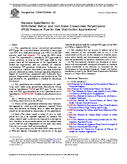 1.1 This specification covers crosslinked polyethylene (PEX) pipe that is outside diameter controlled in metric pipe sizes (DN 16 to 1000) and inch pipe sizes (NPS 3 to 54), and pressure rated (see Appendix X1) using the MRS rating system. This Specification is intended for PEX pipe made by various processes, as long as the PEX pipe made by that process meets all the requirements of this Specification. Included are requirements and test methods for material, workmanship, UV protection, dimensions, hydrostatic sustained pressure, stabilizer functionality, bent-pipe hydrostatic pressure, chemical resistance, minimum operating temperature, degree of crosslinking, squeeze-off, and hydrostatic burst pressure. Requirements for pipe markings are also given. The pipe covered by this specification is intended for natural gas distribution.