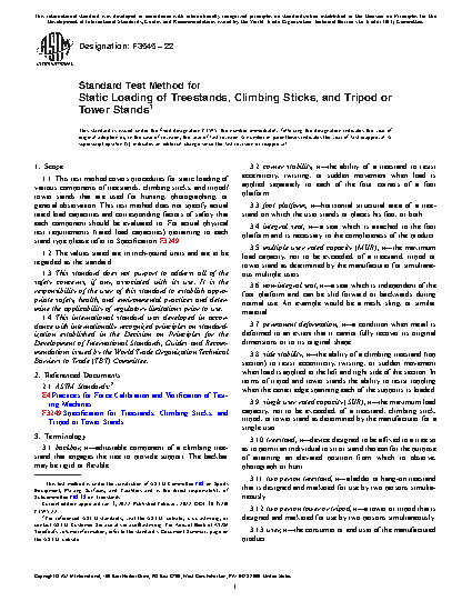 1.1 This test method covers procedures for static loading of various components of treestands, climbing sticks, and tripod/tower stands that are used for hunting, photographing, or general observation. This test method includes the corresponding factors of safety that each component should be evaluated to as shown in Table 1.