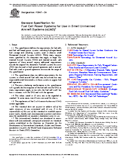 1.1 This specification defines the requirements for fuel cells and fuel cell based power systems, including hydrogen-based fuel storage and refueling systems used in electric small Unmanned Aircraft Systems (sUAS). While many requirements specified by this document may apply to larger Unmanned Aircraft Systems (UAS) and manned aircraft, safe operation of these aircraft require additional requirements outside the scope of this document. Fuel cell systems for use in sUAS may be used in both ground operations and in aircraft. Fuel cells used in ground operations are outside the scope of this specification.