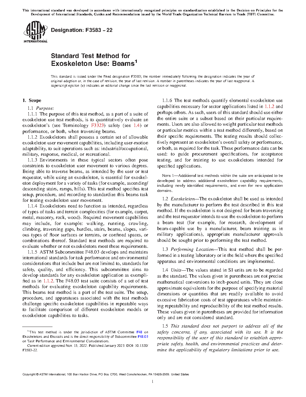 1.2 Exoskeleton—The exoskeleton shall be used as intended by the manufacturer to perform the test described in this test method. If the exoskeleton is not designed for beam traversing and the test requestor intends to use the exoskeleton to perform a beam test (for example, for research, development of beam-capable use by a manufacturer, beam training as in military applications), appropriate manufacturer approvals should be sought prior to performing the test method.