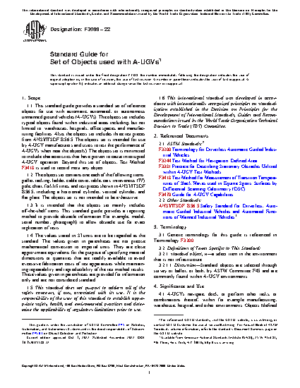1.1 This standard guide provides a standard set of reference objects for use with automatic, automated, or autonomous unmanned ground vehicles (A-UGVs). The objects set includes typical objects found within industrial areas including, but not limited to: warehouses, hospitals, office spaces, and manufacturing facilities. Also, the objects set includes three test pieces from ANSI/ITSDF B56.5. The objects set is intended for use by A-UGV manufacturers and users to test the performance of A-UGVs when near the object(s). The objects set is minimized to include characteristics that have proven to cause interrupted A-UGV operation. Beyond this set of objects, Test Method F3418 is used to record most any object.