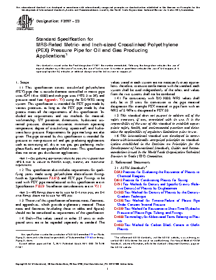 1.1 This specification covers crosslinked polyethylene (PEX) pipe that is outside diameter controlled in metric pipe sizes (DN 16 to 1000) and inch pipe sizes (NPS 3 to 54), and pressure rated (see Appendix X1) using the ISO MRS rating system. This specification is intended for PEX pipe made by various processes, as long as the PEX pipe made by that process meets all the requirements of this specification. Included are requirements and test methods for material, workmanship, UV protection, dimensions, hydrostatic sustained pressure, chemical resistance, minimum operating temperature, degree of crosslinking, squeeze-off, and hydrostatic burst pressure. Requirements for pipe markings are also given. The pipe covered by this specification is intended for pressure or non-pressure oil and gas producing applications such as conveying oil, dry or wet gas, gas gathering, multiphase fluids, and non-potable oilfield water. This specification does not cover gas distribution applications.